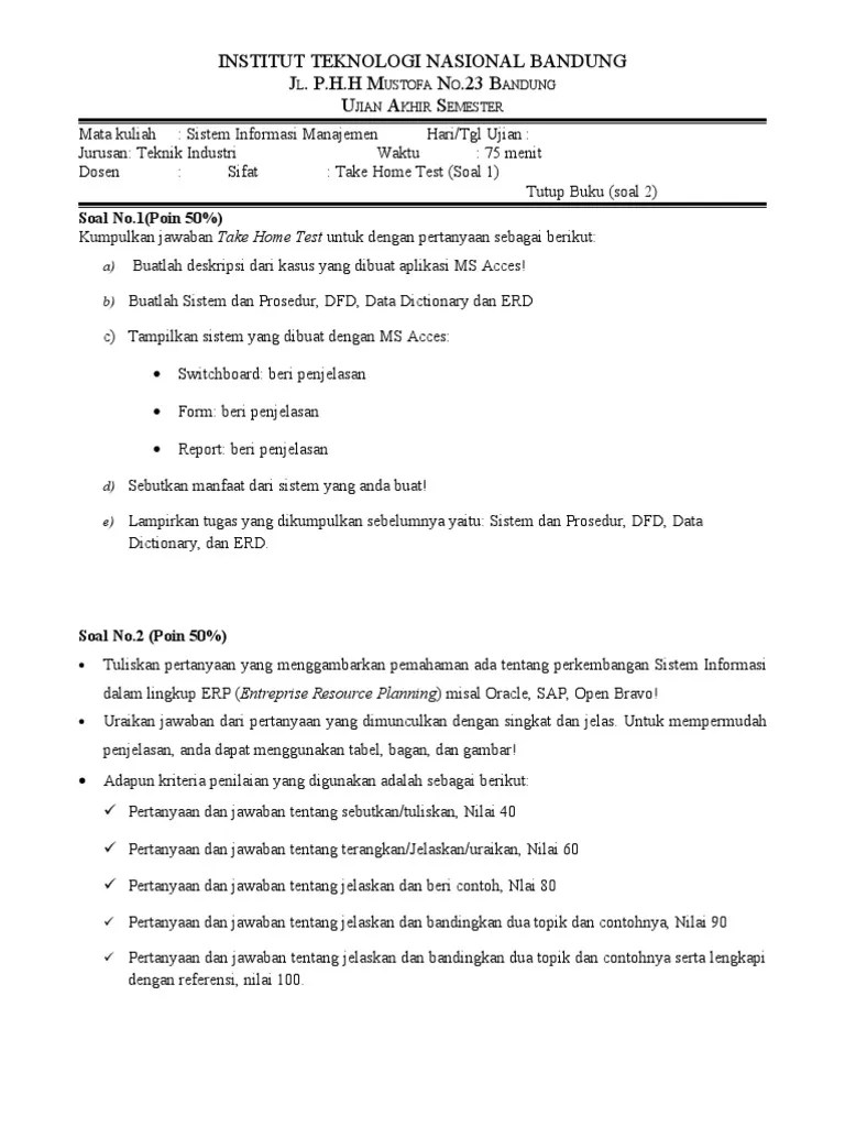 Sistem informasi manajemen (si 3a th 2011/2012). Setiap jawaban memiliki nilai maksimal 25. Materi manajemen & sistem informasi manajemen 2 pertemuan ke 10. Jawaban soal siasebagai tugas mata kuliah sistem informasi akuntansi•. 10202019 berikut ini 10 soal akuntansi sebagai sistem informasi manajemen yang bisa dipelajari. Sekolah yang dapat di cover dengan simdik ini adalah sekolah tk, sd, smp, sma dan sederajat. Cari sebuah perusahaan yang dapat anda analisa mengenai sistem informasi yang sudah berjalan; Soal evaluasi sim bab 8. Pada saat ini kita mengenal ada yang disebut dengan data processing system, manajemen . Soal latihan manajemen & sim 2 · tugas studi kasus manajemen & sim 2. Jaringan tersebut ditujukan untuk para manajer dan bagian penjualan mengenai informasi status penjualan dan persediaan terbaru. Sap if0644 sistem informasi manajemen. Jawaban soal kasus ujian tengah semester.